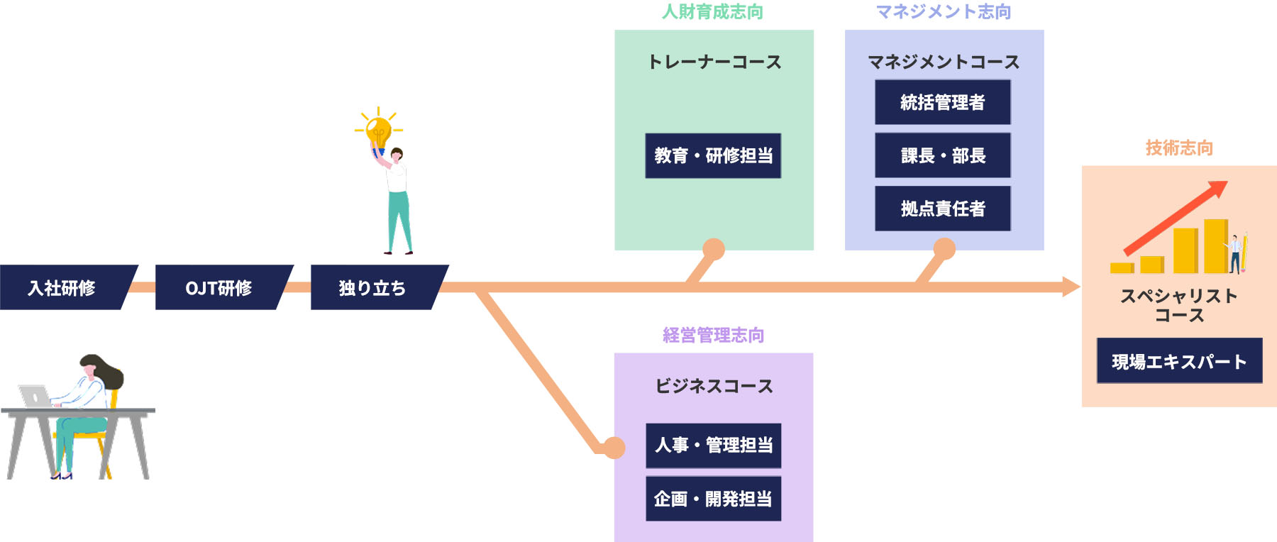 駆けつけスペシャリストとしての道、管理職としてチームを率いる道、教育・研修担当を担う道など、さまざまな役割に挑戦できる環境が整っています。